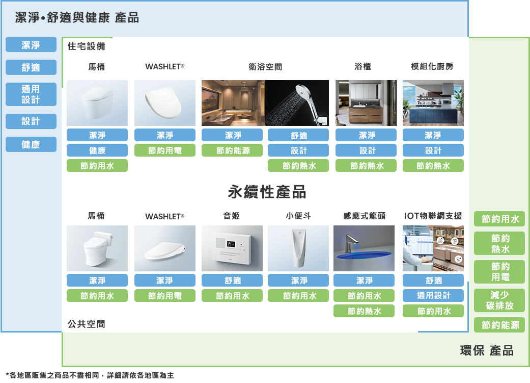 在過去的 100 年之中,TOTO 提供了潔淨・舒適與健康的產品,同時也提供了對環境友善的產品,在 WILL2030 的策略下,我們定義同時滿足這兩項要件的產品為永續性產品。藉由在世界各地推廣永續性產品,我們將能對實現豐富舒適且對環境友善的社會做出貢獻。