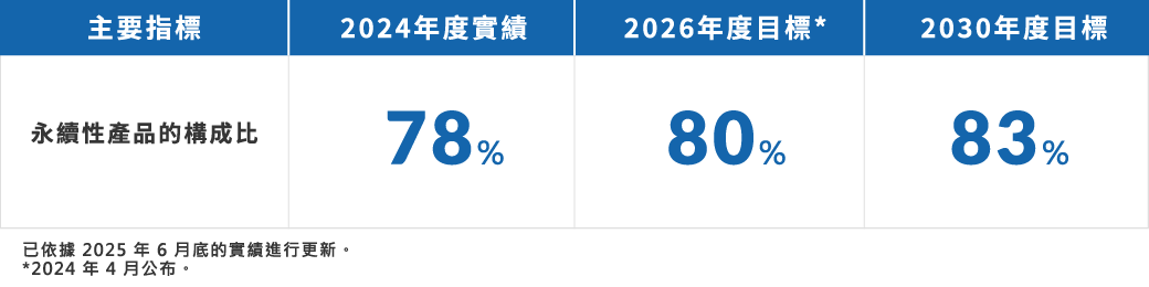 對於 TOTO 來說永續性產品是獨特的,同時實現了潔淨・舒適與健康,並友善環境。在2024年,永續產品佔產品構成的78%,我們的目標是2026年達到80%,2030年達到83%